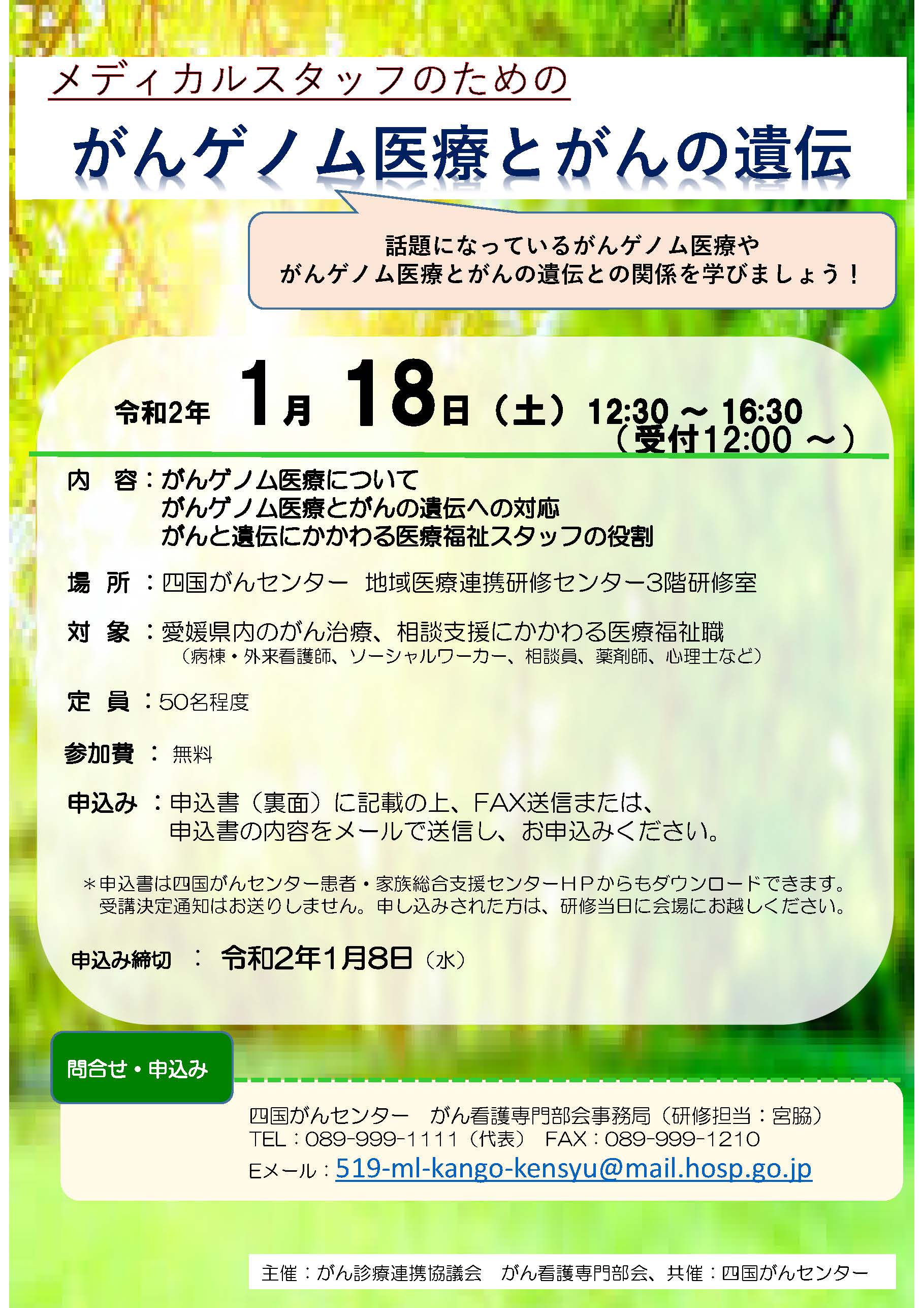 申込書の内容をメールで送信し、お申込みください。 専用申込み書(PDF:210KB) *申込書は四国がんセンター患者・家族総合支援センターHPからもダウンロードできます。 受講決定通知はお送りしません。申し込みされた方は、研修当日に会場にお越しください。 |
