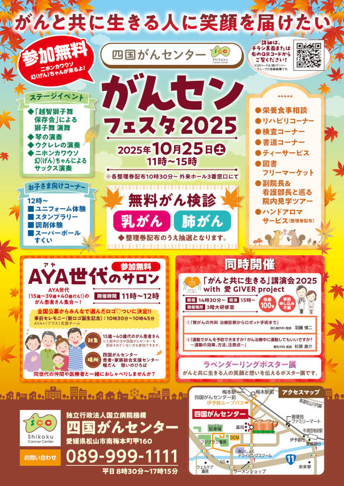四国がんセンターでは、地域のみなさまにがん医療への理解を深めていただくとともに、当センターを身近に感じて親しみを持っていただけるように、「がんセンフェスタ2025」を 2025年10月25日(土) に開催いたします。